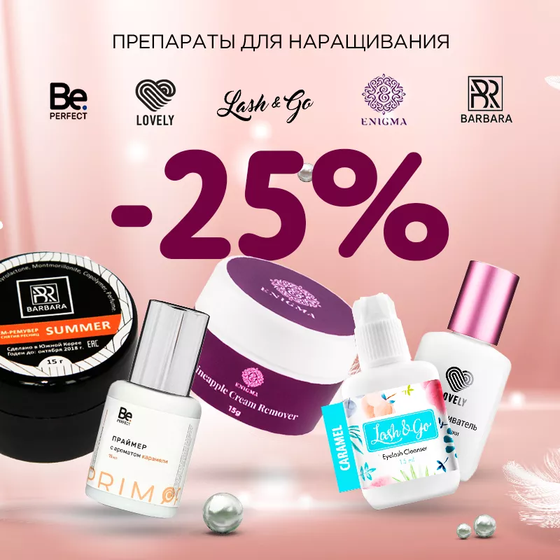 В Ibeauty-Russia новая акция! Скидка 25% на препараты для наращивания брендов Barbara, Be Perfect, Lash&Go, Enigma, Lovely . Скидка действительна до 5 июня. На товары по акции не распространяются промокоды и данная скидка не суммируется с другими скидками.